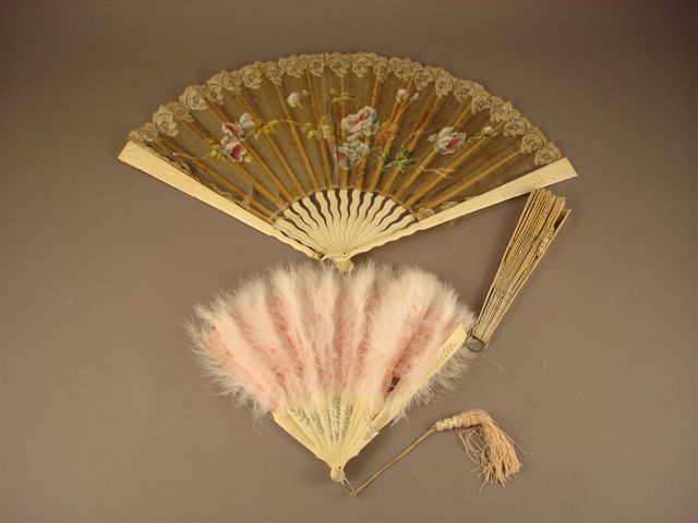 Ensemble d'ÉVENTAILS comprenant trois éventails en os à décor ajouré. L'un est garni de plumes roses agrémenté de passementerie, l'autre d'une feuille de tulle brodé rehaussé de fleurettes, le troisième d'une feuille de tulle brodé rehaussé de roses polychromes. Signé DAUBRÉ.