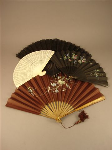 Ensemble d'ÉVENTAILS. Il comprend quatre éventails en bois et en os à décor ajouré. Le premier, la feuille en tulle peint à la gouache d'oiseaux et rameaux fleuris. Monture en bois fruitier. Fin XIXème siècle. Le deuxième, la feuille en tissu noir peint à la gouache de roses et fleurettes. Monture en bois noirci. Fin XIXème siècle. Le troisième, la feuille en gaze noire doublée de dentelle parsemée de fleurs. Monture en bois noirci. Fin XIXème siècle. Le quatrième, de forme brisée, en ivoire repercé et sculpté. Seconde moitié XIXème siècle. Joint un éventail de forme brisée à décor chinoisant (monture accidentée).