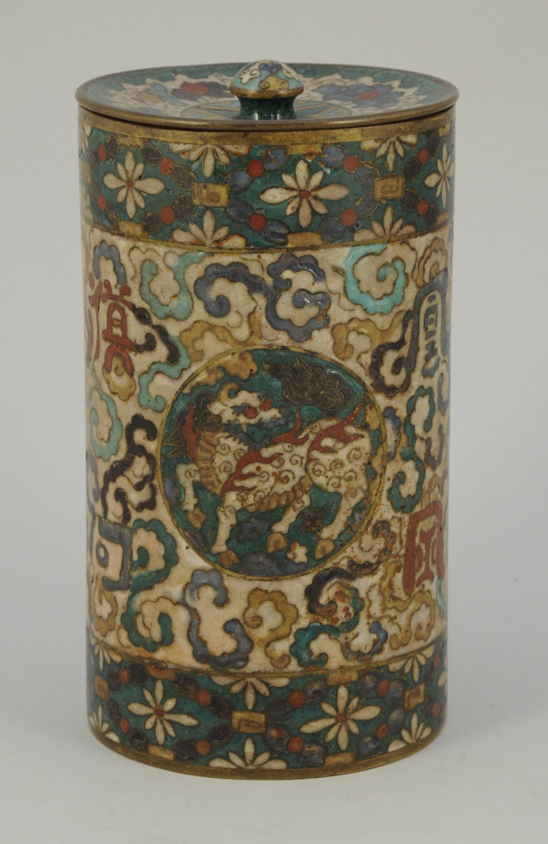 POT couvert de forme cylindrique en cuivre et émaux cloisonnés à décor de médaillons de kilin et phénix. Chine, fin XIXe.