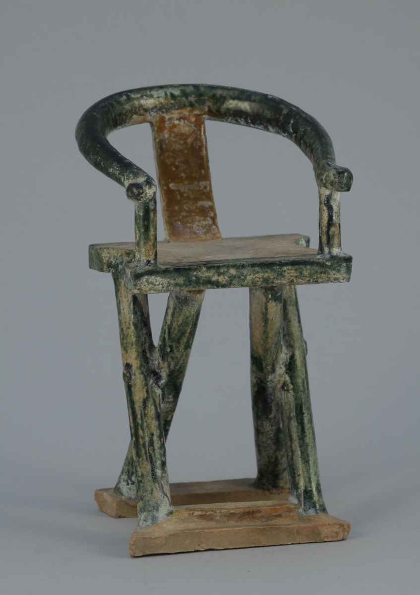 FAUTEUIL à dossier en fer à cheval en terre cuite partiellement glaçurée ocre et vert