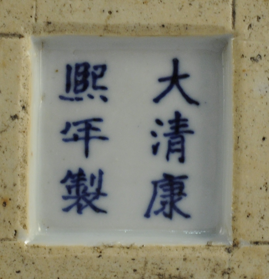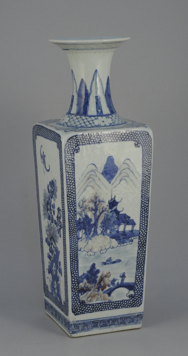 VASE de forme balustre et quadrangulaire en porcelaine blanche décorée en bleu et rouge de cuivre sous la couverte de médaillons de paysage et papillon volant au dessus d'un rocher fleuri de chrysanthèmes. L'épaulement est décoré de quatre chauve souris.