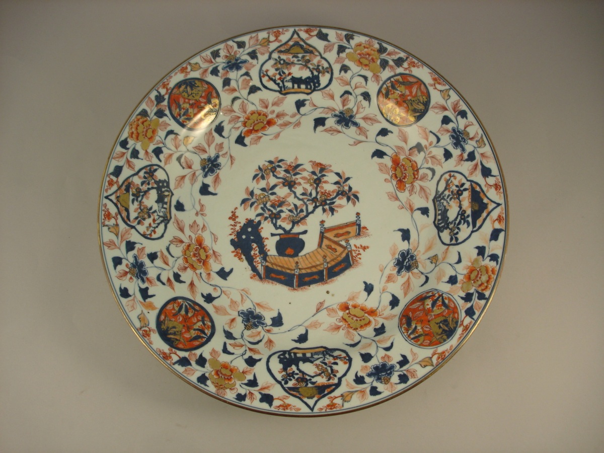 GRAND PLAT en porcelaine de Chine à décor polychrome de fleurs épanouies et de pagodes dans des réserves. Imari. XIXème.