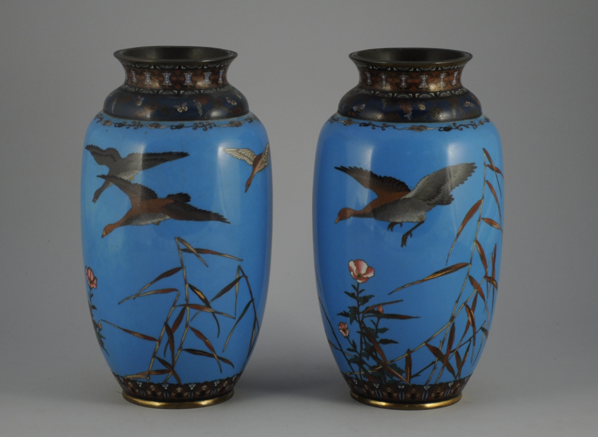 PAIRE de VASES ovoïdes en émail cloisonné à décor tournant de canards sur fond bleu.