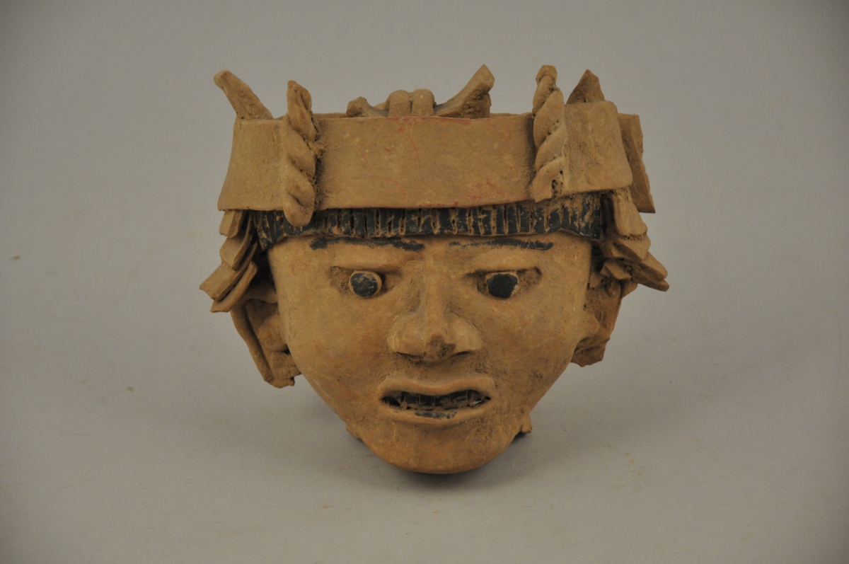 TÊTE D'UNE STATUE. Terre cuite sans engobe, yeux, bouche et bandeau frontal peint de coaltar. Accidents et manques.