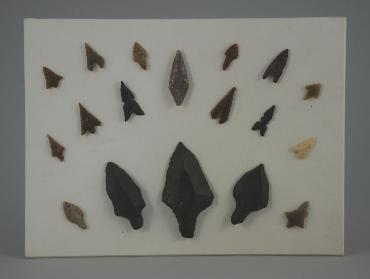 18 pointes de flèche en silex et divers. (collées sur un carton)