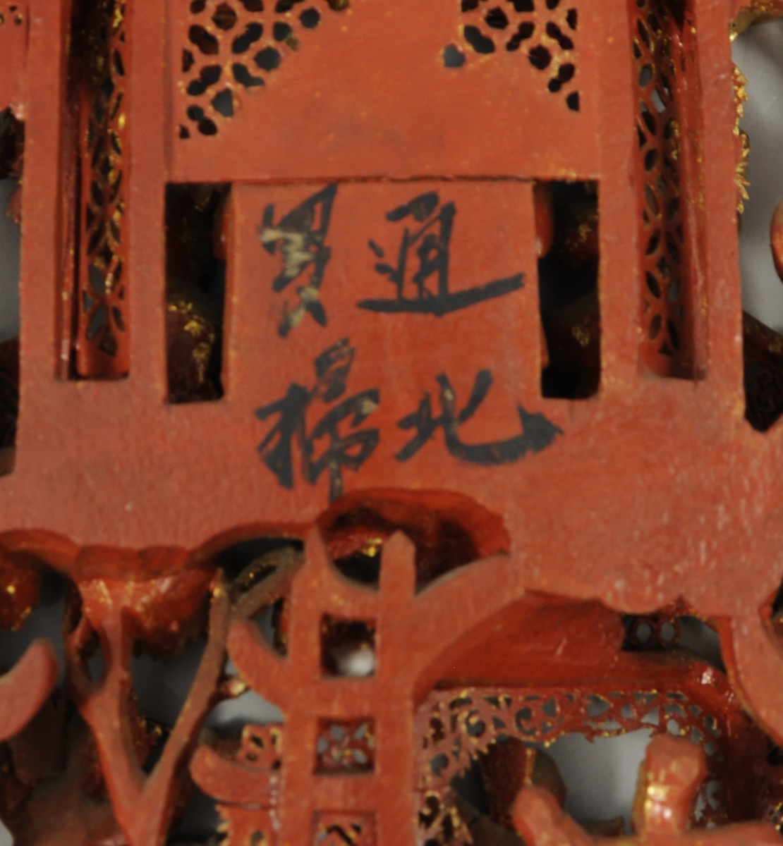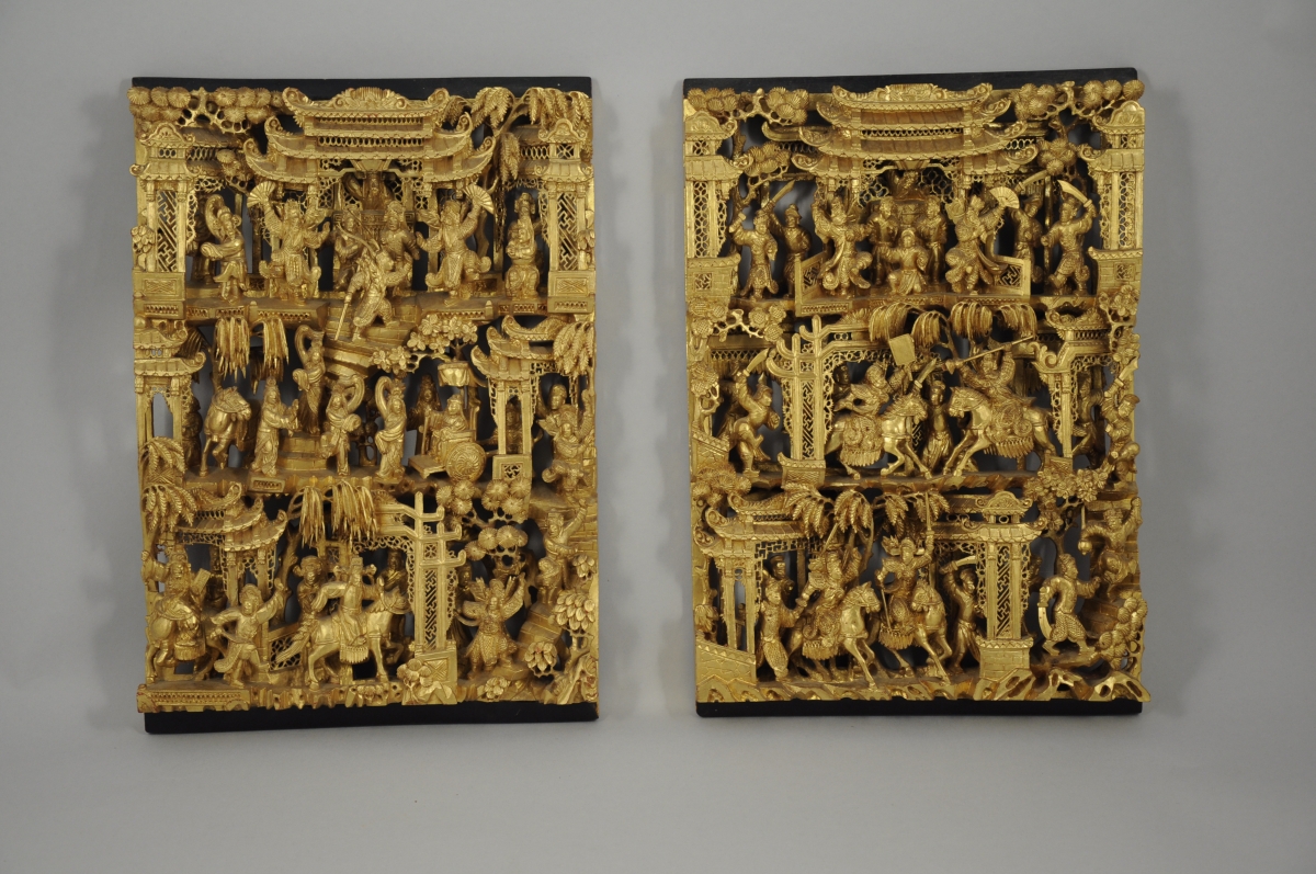 Paire de PANNEAUX faisant pendant en bois richement sculpté, évidé, et doré. Elle représente des scènes animées de danses et de combats, en extérieur et dans un palais.