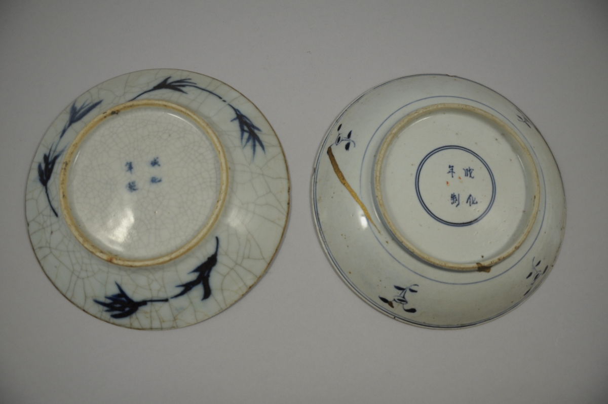 Deux ASSIETTES en porcelaine à décor bleu. L'une de Nankin, XIXème, l'autre avec marque apocryphe de Chenghua.