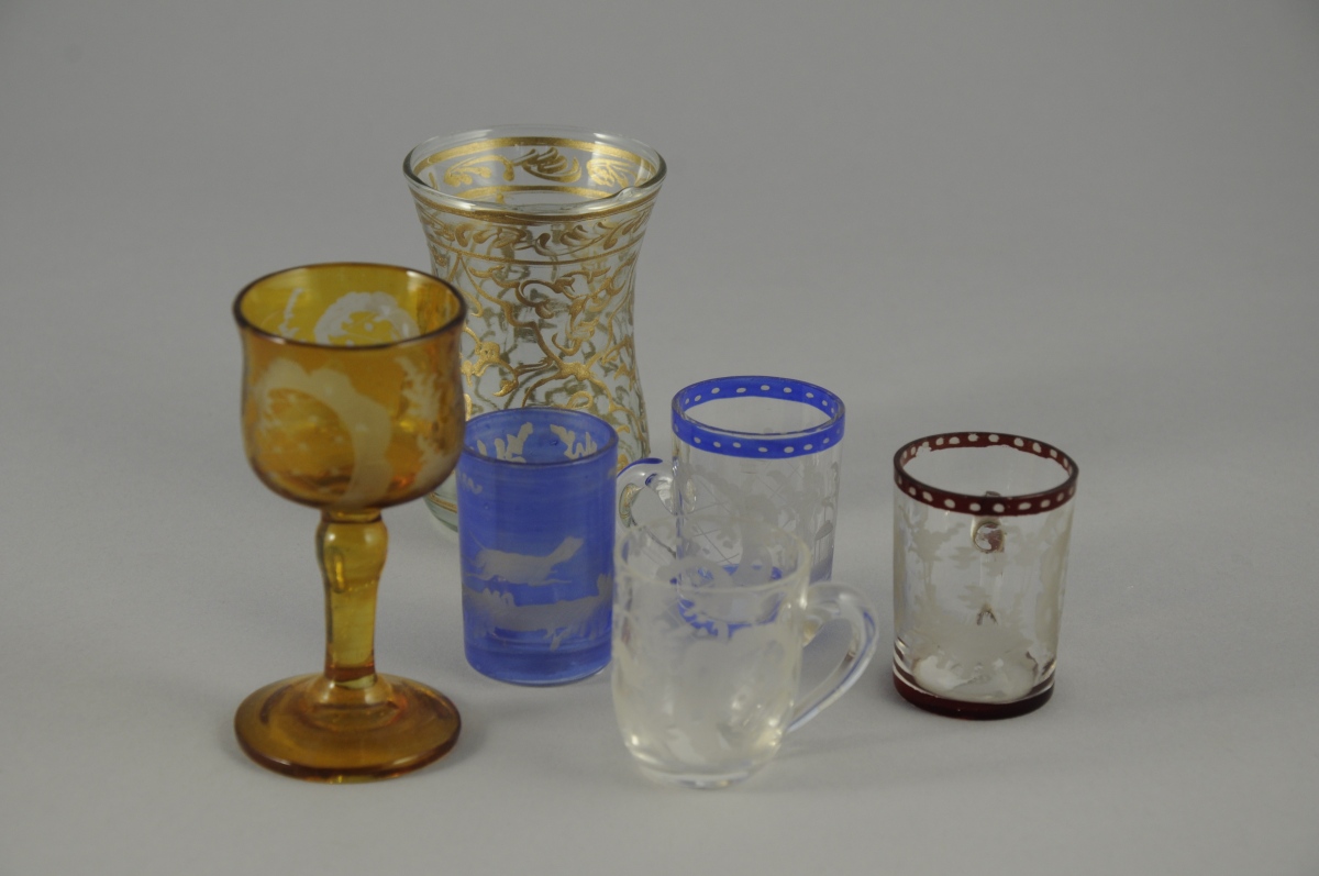 ENSEMBLE en verre comprenant un verre à pied en verre jaune soufflé et gravé d'un cartouche, et quatre petits verres à décor gravé de cartouches rocailles et de pagodes, lièvres, oiseaux et chien.