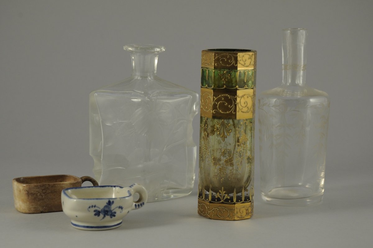 - un flacon en verre en forme de losange gravé de fleurs, Haut. 15 cm.