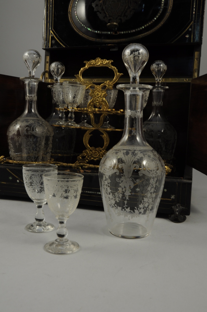 CAVE à LIQUEURS en placage de bois noirci, avec incrustations de filets de laiton et de petits ronds de nacre. Sur le couvercle et en façade, renflements ornés d'écussons en laiton doré. Intérieur plaqué de palissandre, comprenant sur un support de bronze doré, quatre carafes et sept verres à pieds à décor gravé de guirlandes végétales.