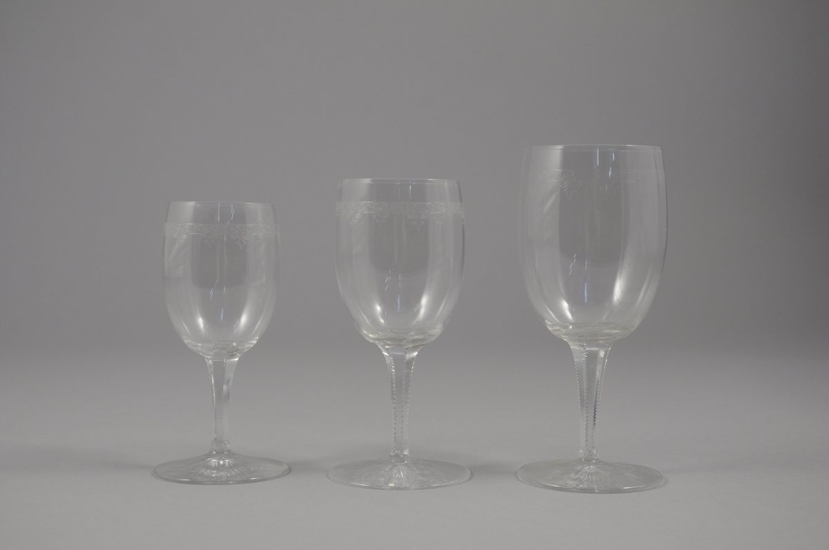 Partie de SERVICE de verres à pied en cristal comprenant 13 verres à vin, 10 verres de taille moyenne et 13 verres plus petits. Décor gravé de fleurons. Base taillée en étoile, tige à pans.