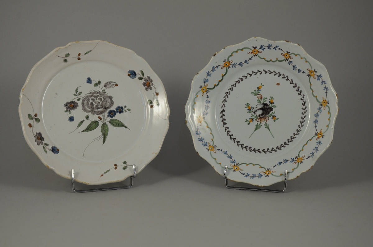 Deux ASSIETTES en faïence à décor floral en polychromie de grand feu. Ailes chantournées.