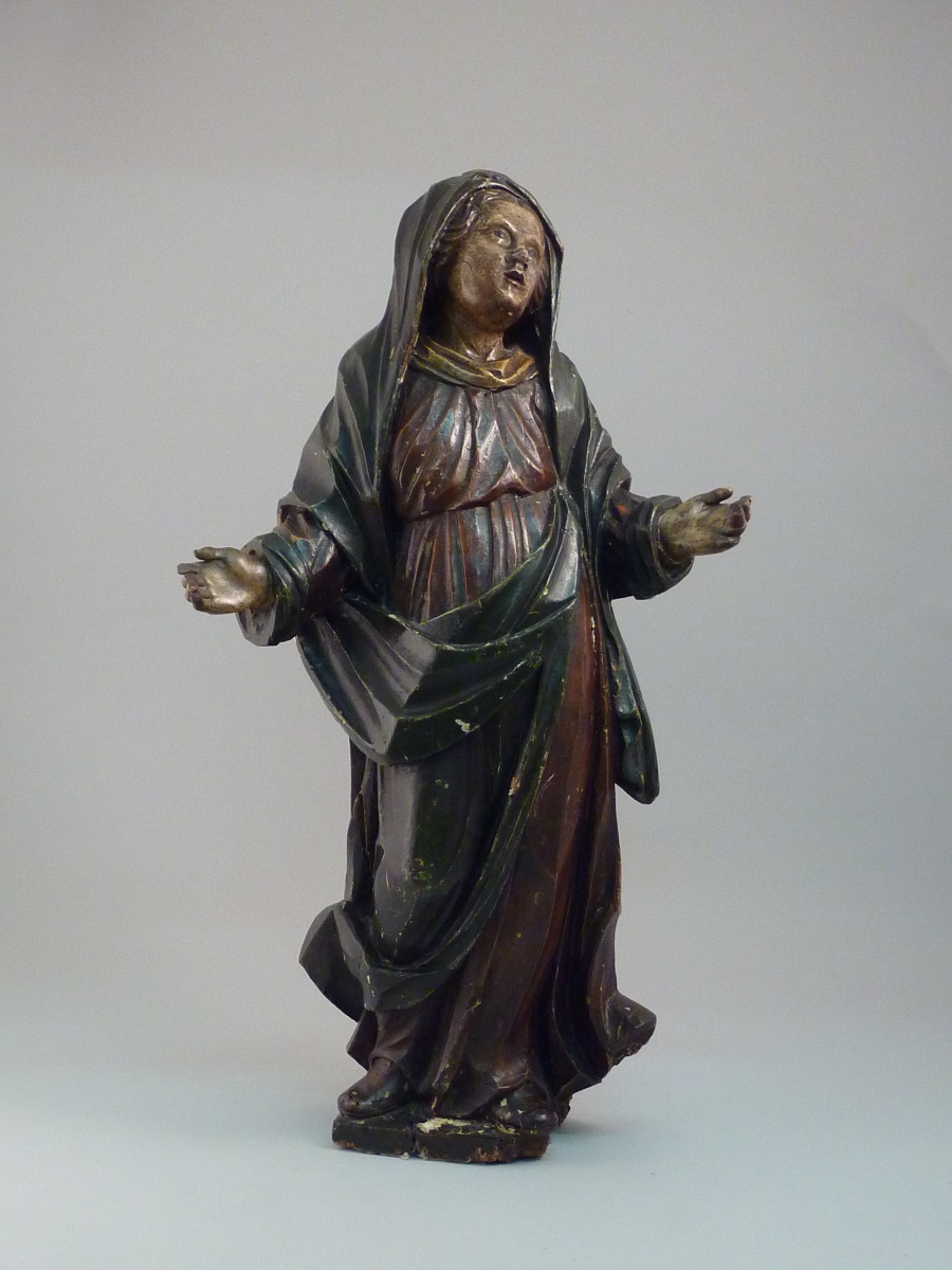 La Vierge apparaît enceinte et compte tenu des traits de son visage marquant l'étonnement, ainsi que la position des mains dénotant un geste de résignation, il nous semble possible qu'il s'agisse d'une Vierge de l'Annonciation.