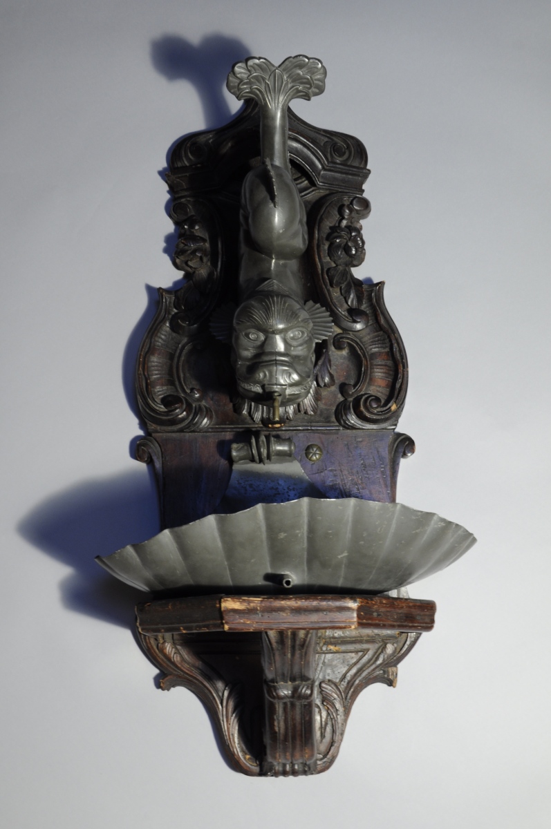 FONTAINE d'applique en étain, figurant un dauphin, avec sa vasque en forme de coquille. Support de bois sculpté de motifs rocaille et de fleurs en chutes sous un chapiteau.