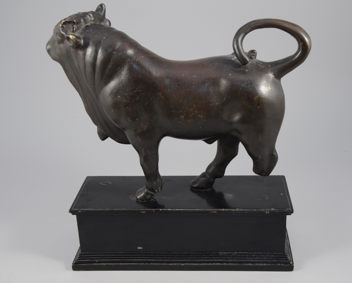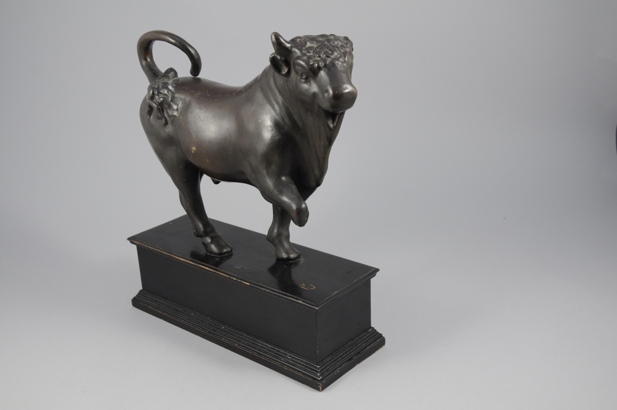 TAUREAU À L'ANTIQUE en bronze à patine brune. Haut. 27, Long. 36, Larg. 10 cm (queue accidentée, manque deux pattes et la corne gauche). Sur son socle rectangulaire de bois noirci.