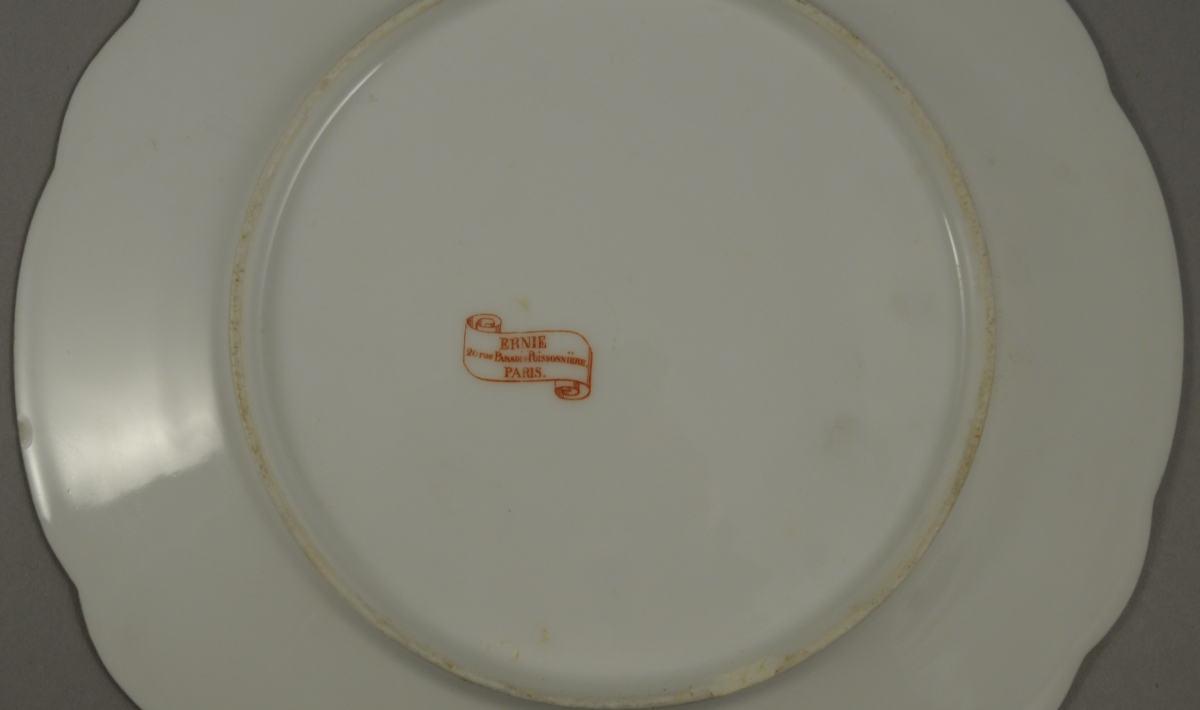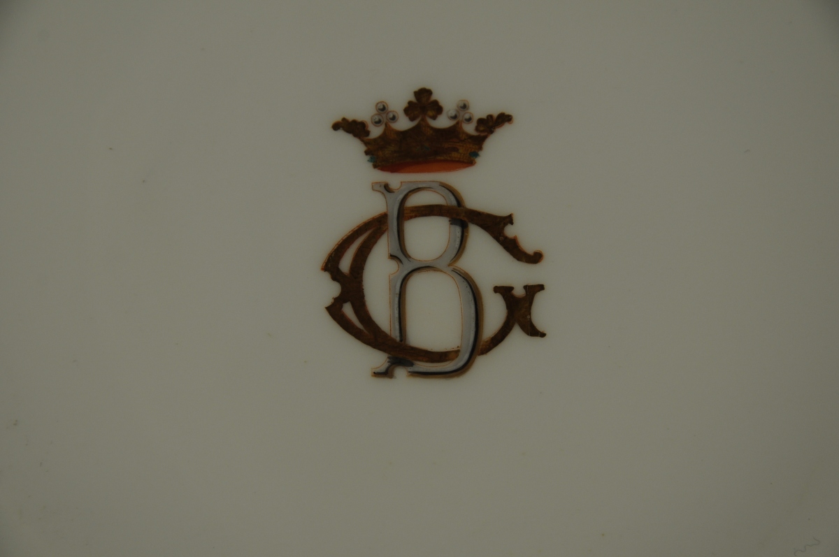 SUITE DE 18 ASSIETTES A DESSERT en porcelaine à aile chantournée à décor d'une frise gris et or. Monogrammé au centre CB, couronne de marquis. Travail de la Maison Ernié, 20 rue Paradis-Poissonnière.
