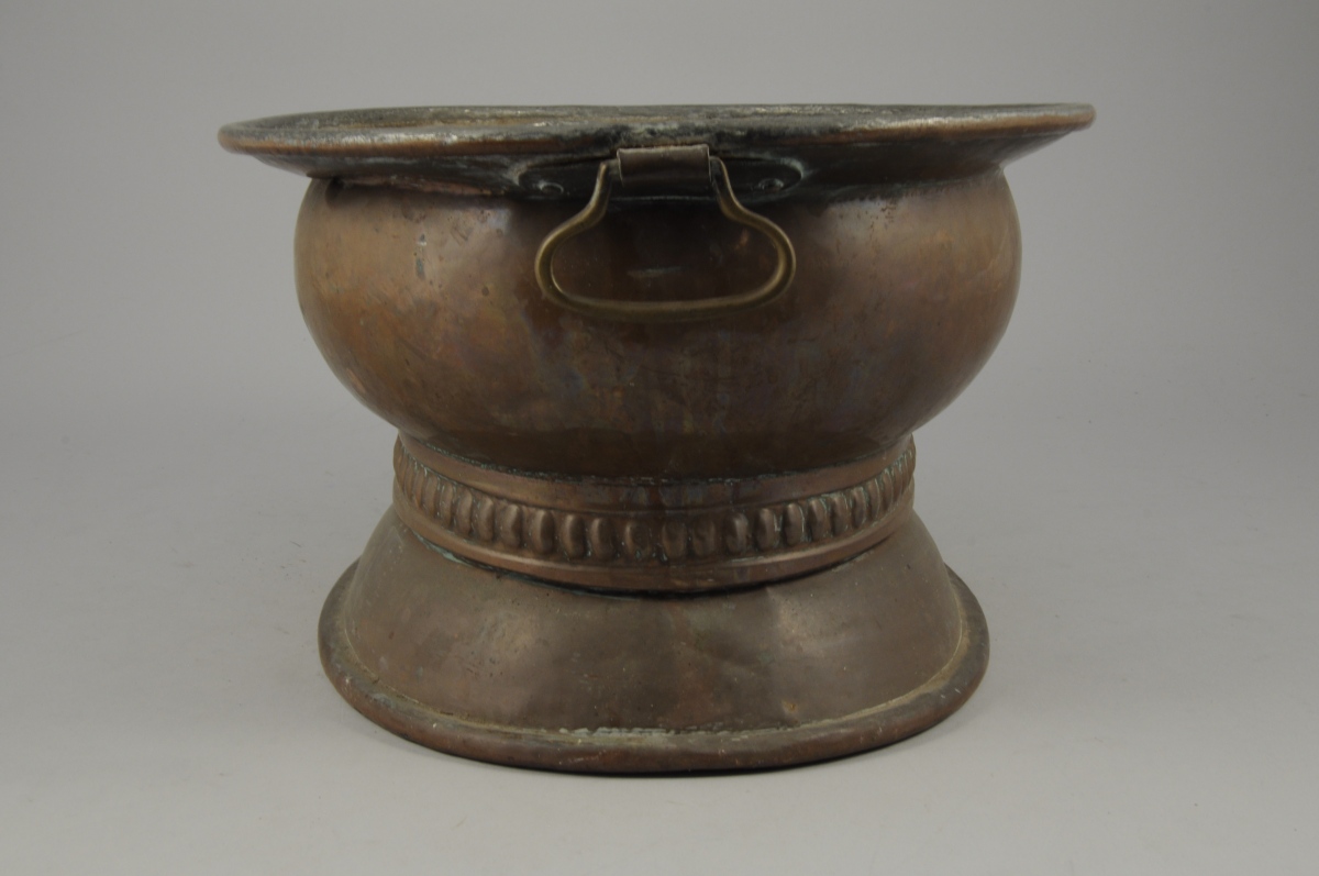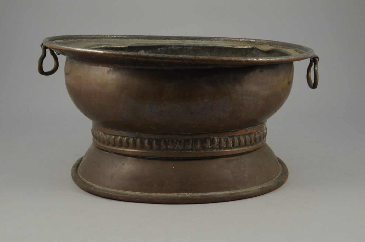 BASSIN en cuivre de forme ovale à deux anses. Piédouche orné d'une frise de godrons.
