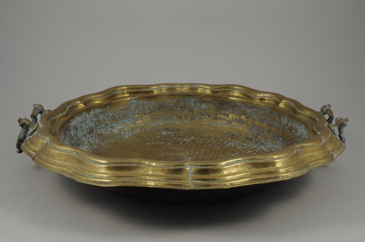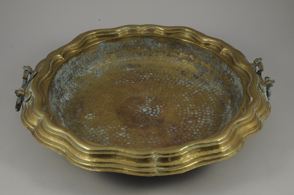 GRAND BASSIN en laiton martelé et à contours moulurés. Muni de deux anses.