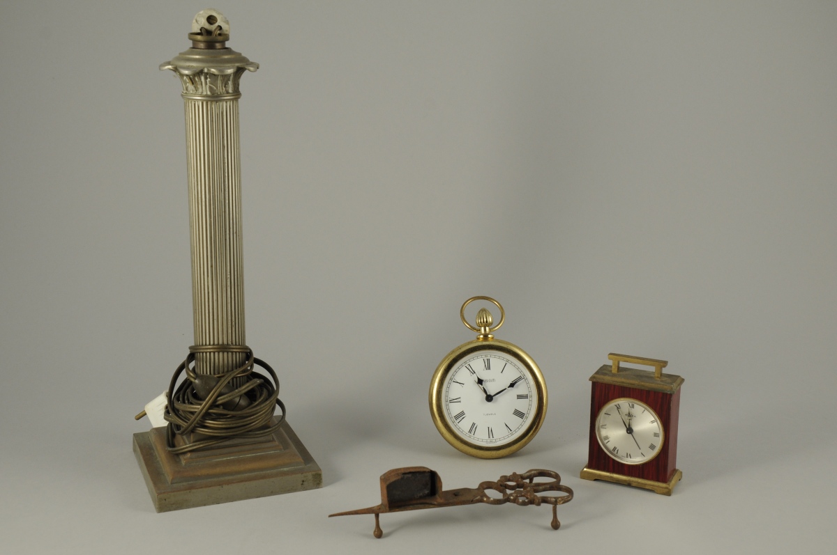 ENSEMBLE DE BIBELOTS : colonne en bronze argenté formant pied de lampe, mouchettes en acier, réveil de table SWIZA et réveil moderne.