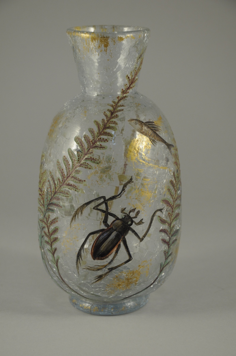 Vase ovoïde à col resserré en verre transparent bleuté "clair-de-lune" et craquelé. Décor gravé en creux prononcé, peint et partiellement doré d'un milieu aquatique : plantes, insecte dit dytique géant, et poissons de la famille des perches.