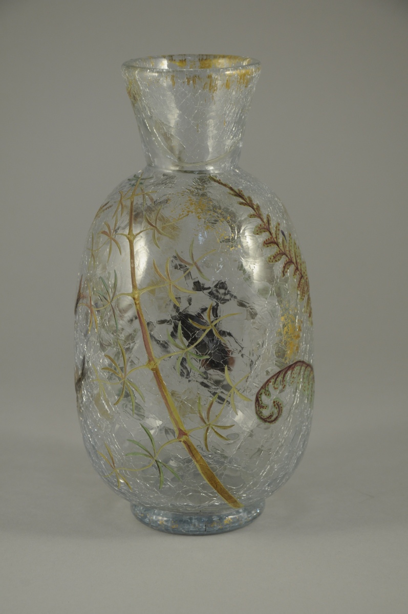 Notre vase est donc très représentatif de la première période allant de 1878 à 1884 pendant laquelle Gallé s'essaie à toutes sortes de techniques. Sa forme rappelle également les flacons de parfum, parfois en craquelé, produit dans la même période à col resserré et base bourrelée. De plus, son décor aquatique est très caractéristique du maître verrier qui était aussi un botaniste, scientifique membre de l'Académie de Stanislas dès 1890. Ce décor naturaliste n'est pas émaillé mais peint et doré. Même si Gallé grave à la roue, à l'émeri ou au plomb depuis ses débuts, notre décor reste ici inédit. En effet, gravé puis peint dans l'intaille, ce type de décor sur verre ne semble pas avoir été produit en grande quantité par le verrier d'exception Émile Gallé. L'on peut supposer que ce vase appartienne à une petite série d'une des nombreuses techniques auxquelles Gallé s'est essayées. Artiste génial, possédant une connaissance technique et scientifique inédite, l'uvre protéiforme de Gallé reste encore à étudier.