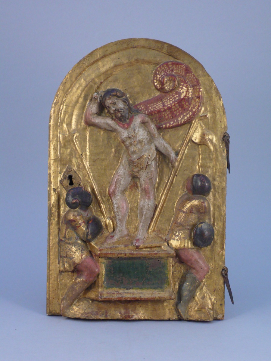 Bois sculpté en ronde bosse, peint en couleurs et doré, représentant La Résurrection du Christ.