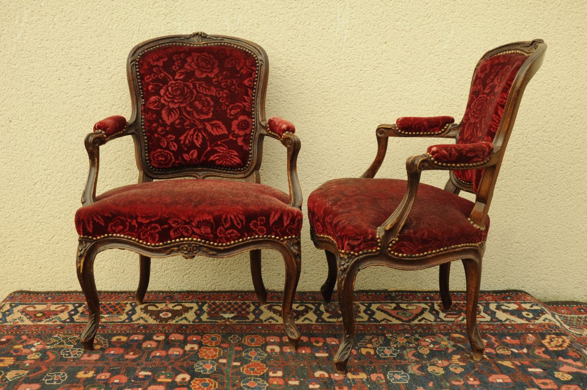 PAIRE de FAUTEUILS cabriolet en hêtre sculpté, mouluré et teinté. Le dossier légèrement cintré flanqué de feuilles d'acanthe. Les accotoirs en fort coup de fouet. Les traverses centrées d'un bouquet de fleurs. Ils reposent sur des pieds cambrés à décor d'une fleur et terminés par des feuilles d'acanthe.