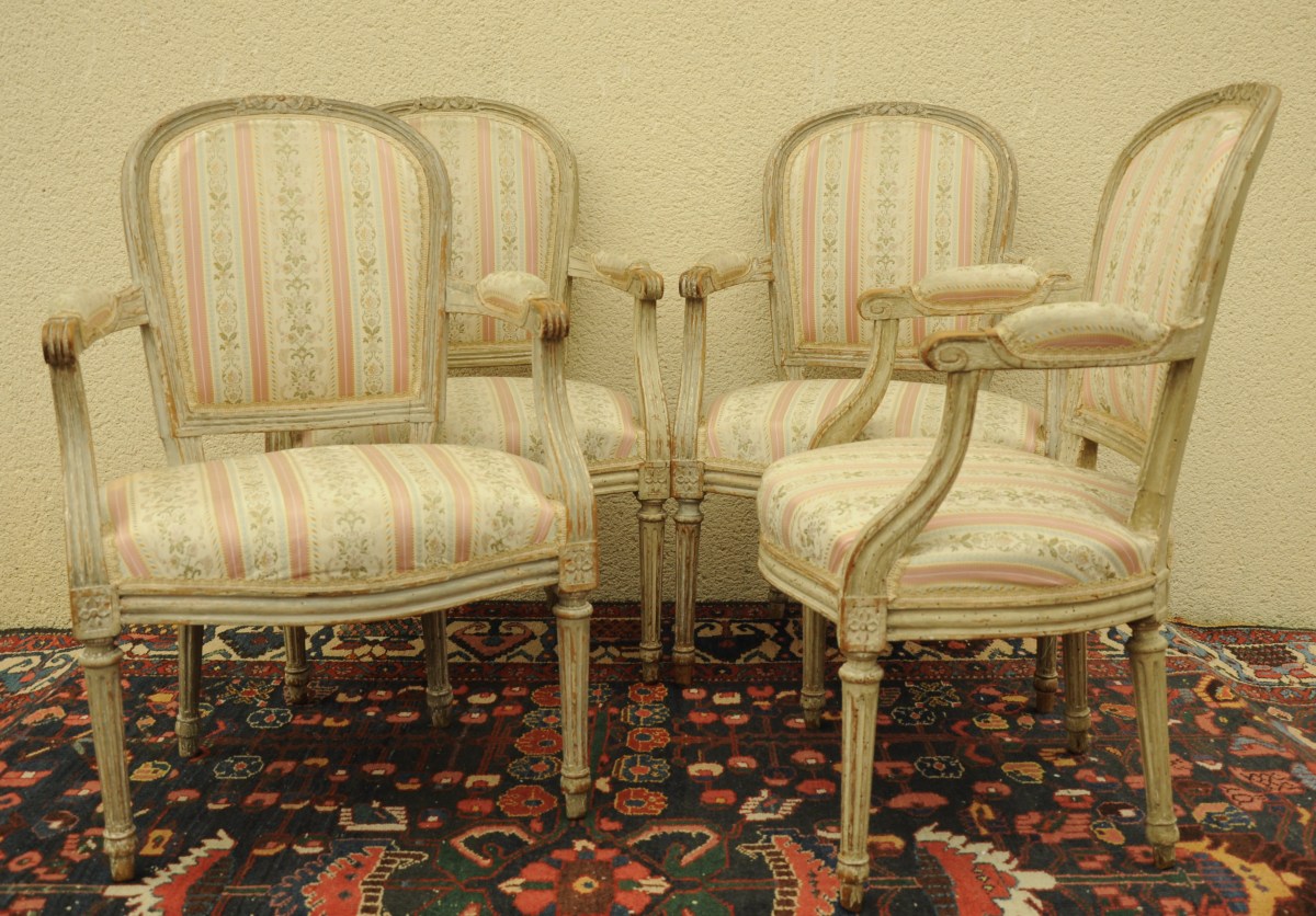 SUITE de QUATRE FAUTEUILS cabriolet en hêtre mouluré et relaqué crème. Traverse supérieure ornée d'un nud de rubans. Dés de raccordement sculptés de fleurettes. Pieds fuselés et cannelés.