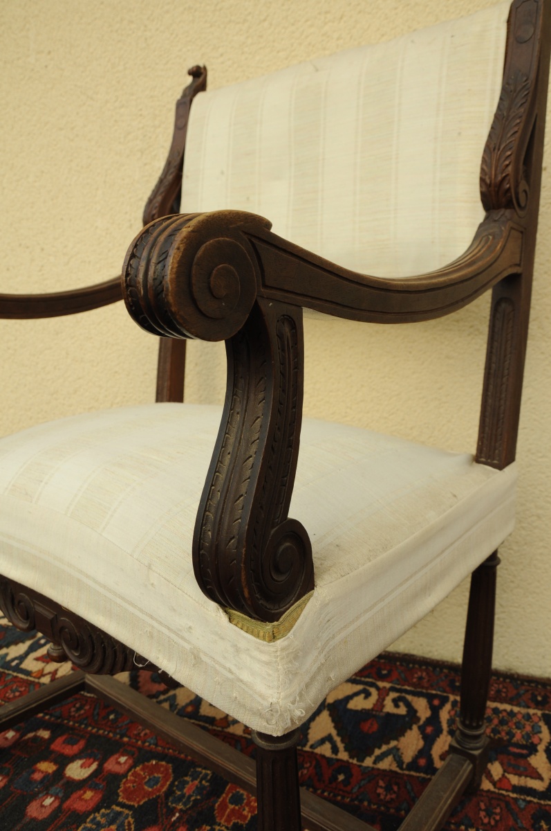 PAIRE DE FAUTEUILS À BRAS à haut dossier en noyer sculpté. Le dossier flanqué de consoles feuillagées à enroulement. Les accoudoirs nervurés et les supports d'accoudoirs en S. Piétement cannelé rudenté à entretoise en H. Recouvert pour l'un d'une tapisserie au point représentant une dame et un bord de rivière.