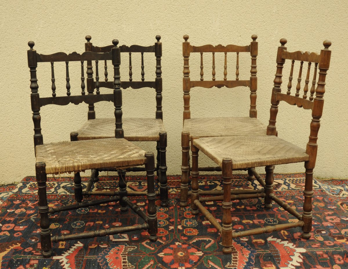 QUATRE CHAISES en bois tourné. Le dossier découpé et à fuseaux tournés. Pieds en boules aplaties reliés entre eux par un fuseau tourné. Assises tressées.