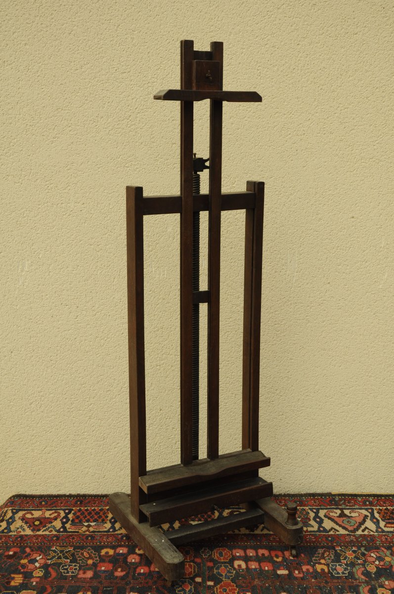 CHEVALET DE PEINTRE en chêne. Repose sur des roulettes. Vers 1900.