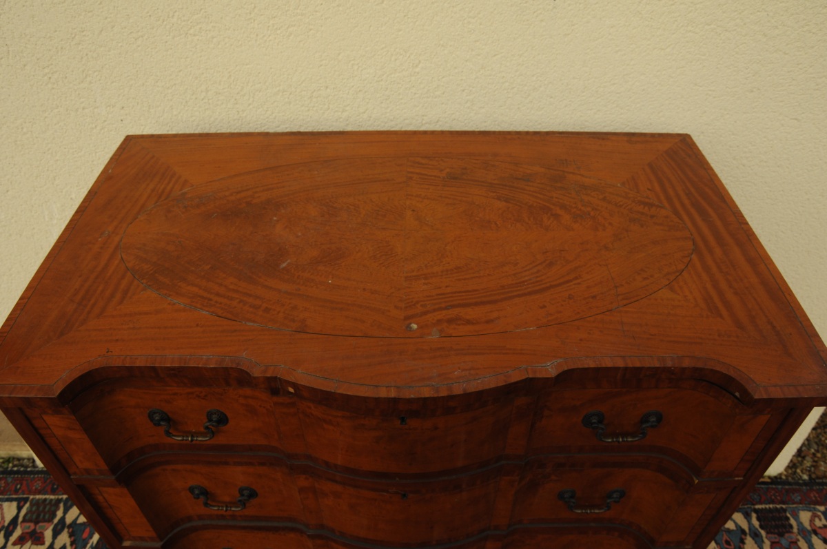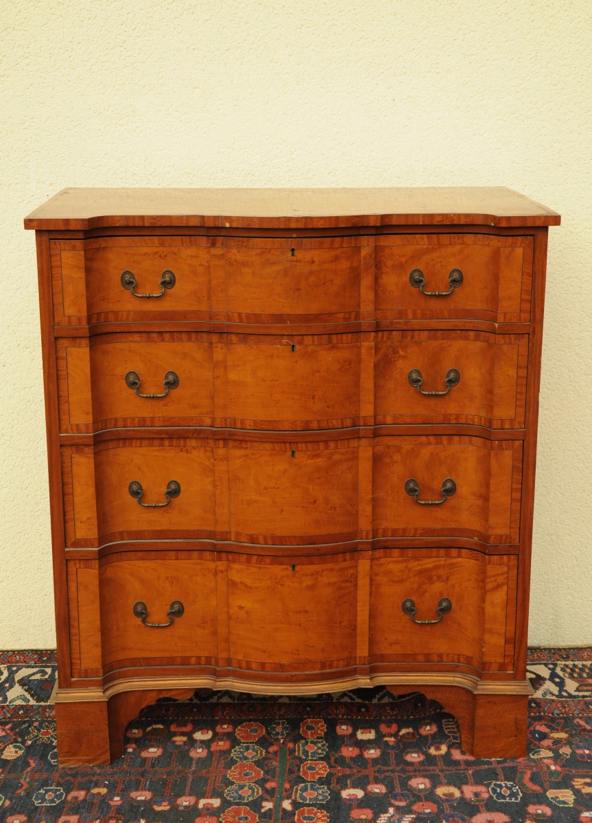 COMMODE HAUTE à façade arbalète en bois de placage. Ouvre à quatre tiroirs de hauteurs croissantes.