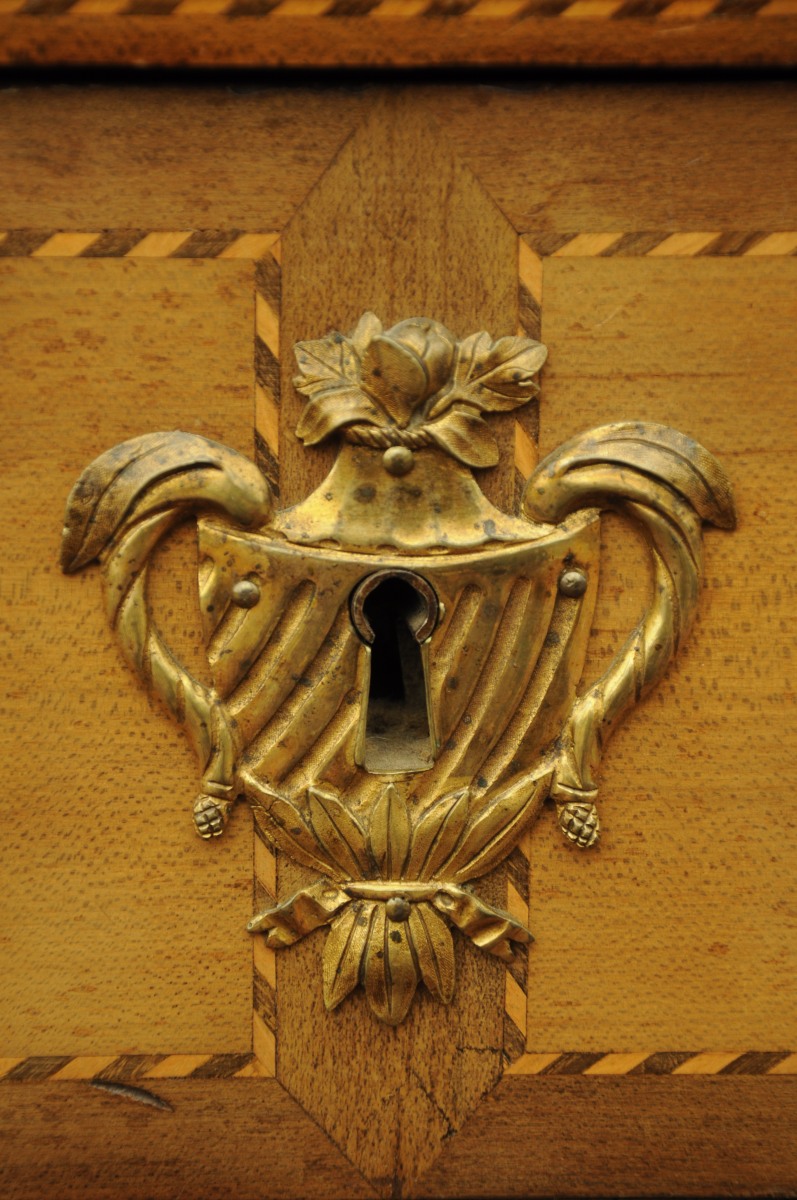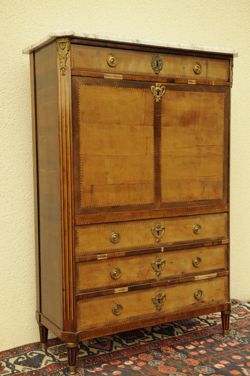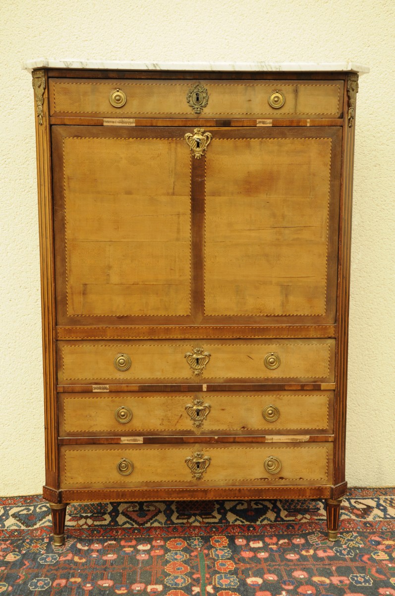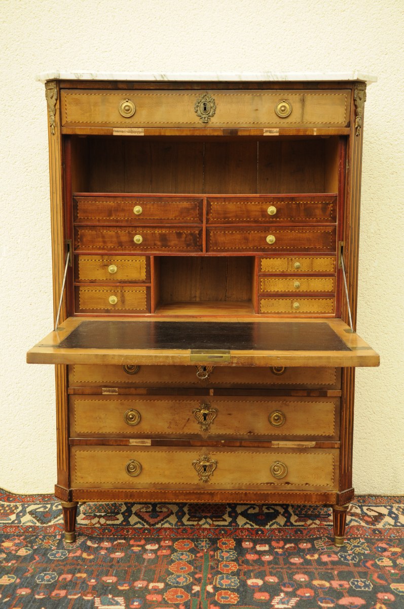 SECRÉTAIRE à abattant en bois de placage et filets marquetés. Les angles sont ornés de cannelures simulées. Il ouvre par trois tiroirs en partie inférieure et un tiroir au-dessus de l'abattant. Ce dernier, foncé de cuir noir, découvre un intérieur à casiers et petits tiroirs. Ornementation de bronzes dorés, tels que chutes d'angles, entrées de serrures en forme de vases fleuris, poignées mobiles. Dessus de marbre blanc veiné.