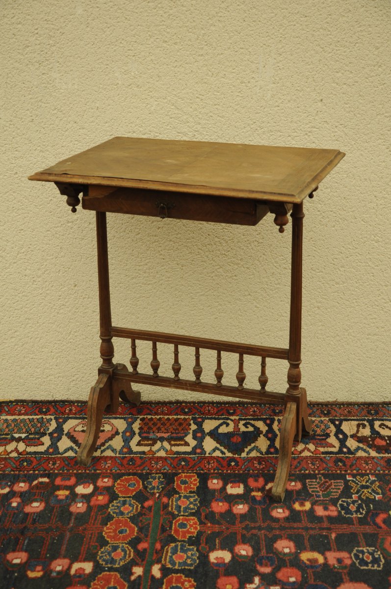 TABLE à OUVRAGE à piétement en hêtre tourné et cannelé. Elle ouvre par un tiroir en ceinture. Placage de noyer en frise sur le plateau.
