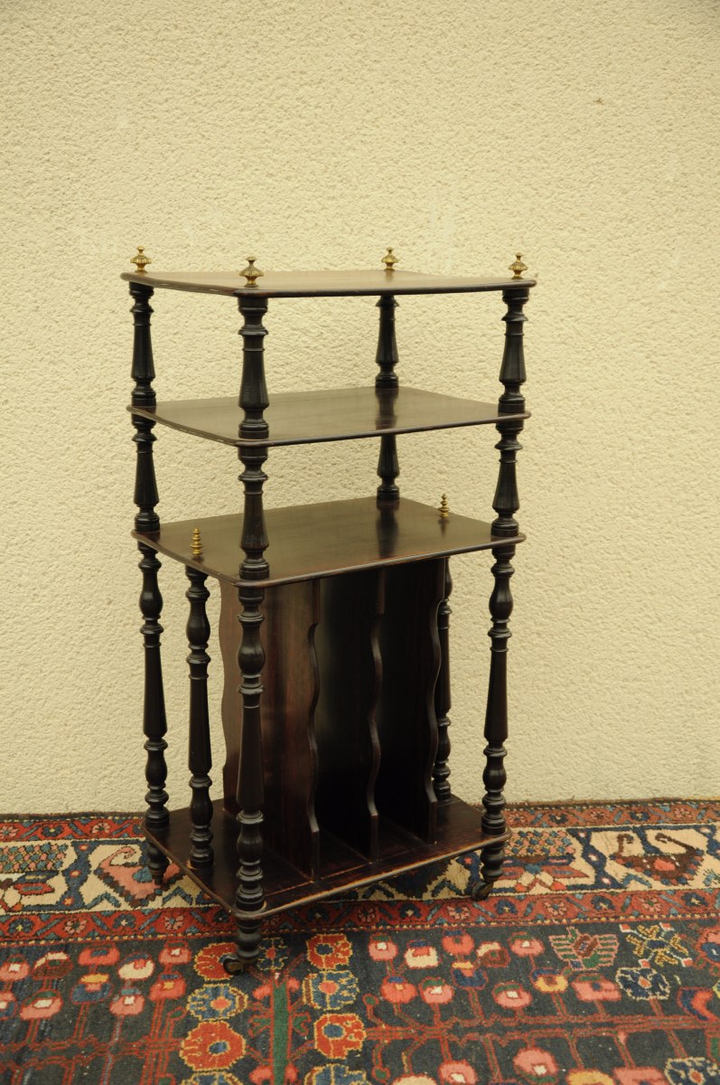 CASIER À MUSIQUE en bois noirci et peint à colonnes tournées. Les pieds sont montés sur de petites roulettes. Fin du XIXème siècle.