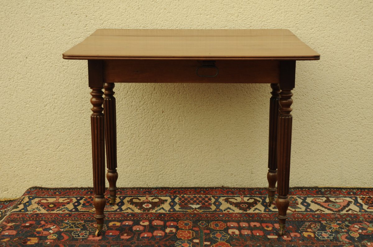 Petite TABLE à abattants en acajou, à pieds tournés, montés sur des roulettes. Elle ouvre par un tiroir en ceinture sur le côté.