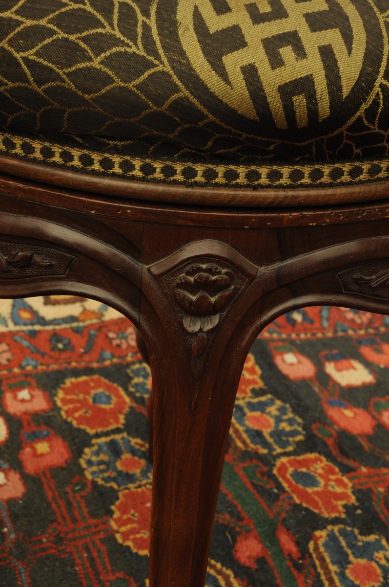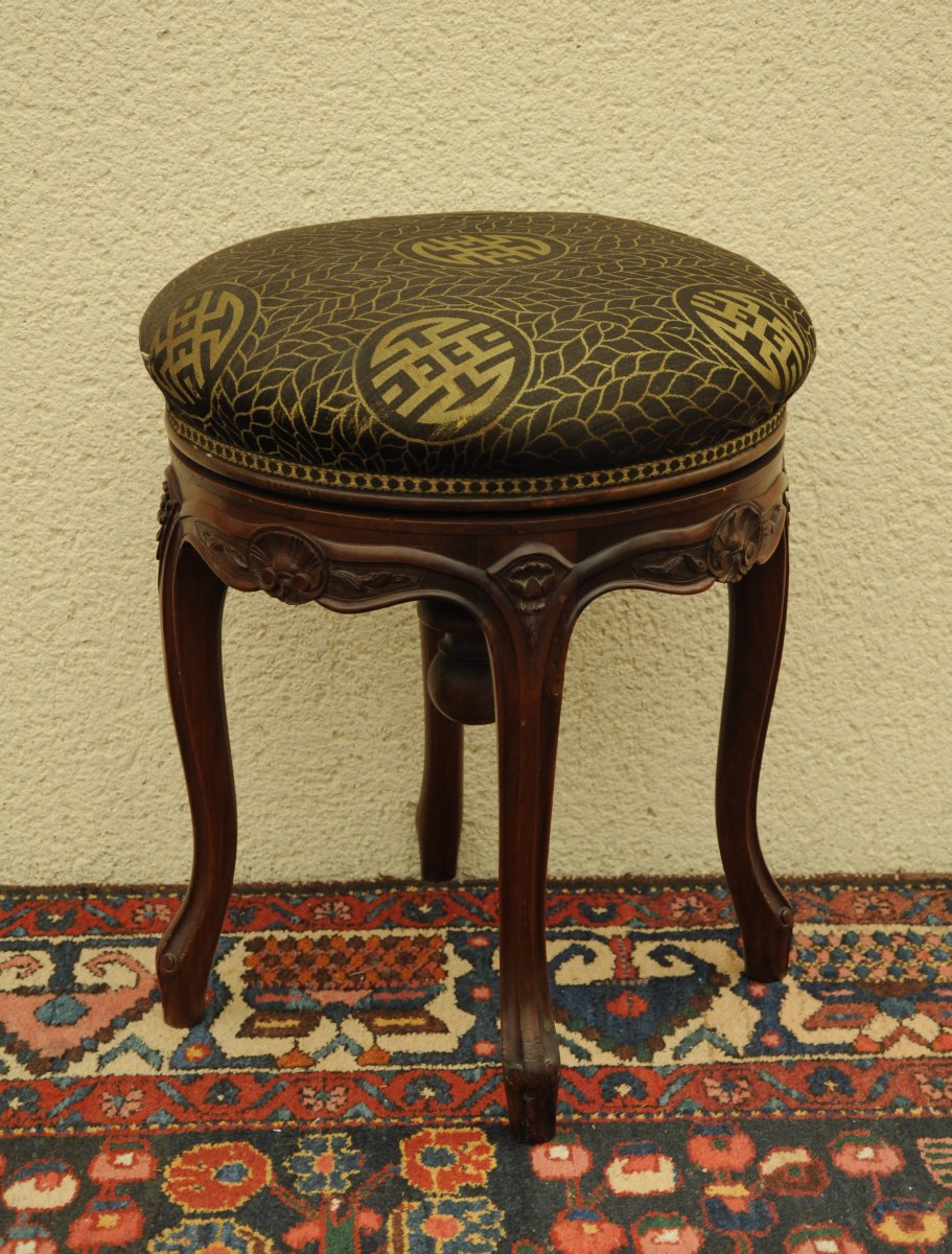 TABOURET de piano en acajou, à pieds cambrés, nervurés et ornés de fleurettes. Ceinture chantournée sculptée de coquilles. Assise réglable en hauteur.