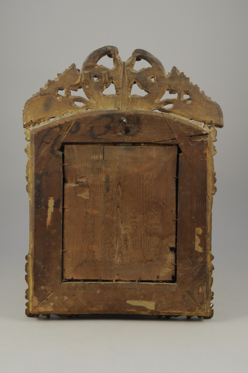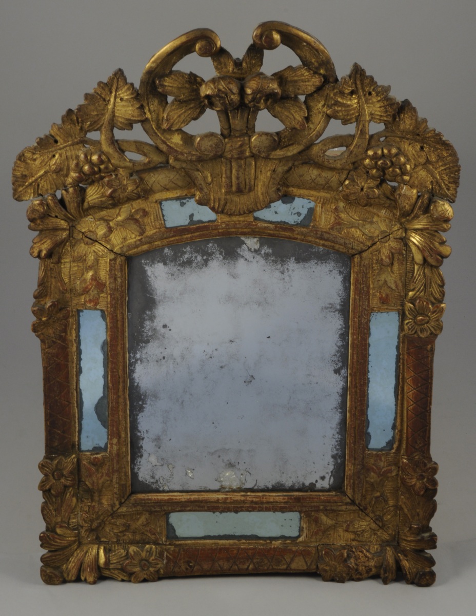 MIROIR en bois sculpté et doré à parecloses. Décor de fleurs et feuillages. Traverse supérieure cintrée, ornée d'un bouquet, de feuilles de vigne et de raisins.