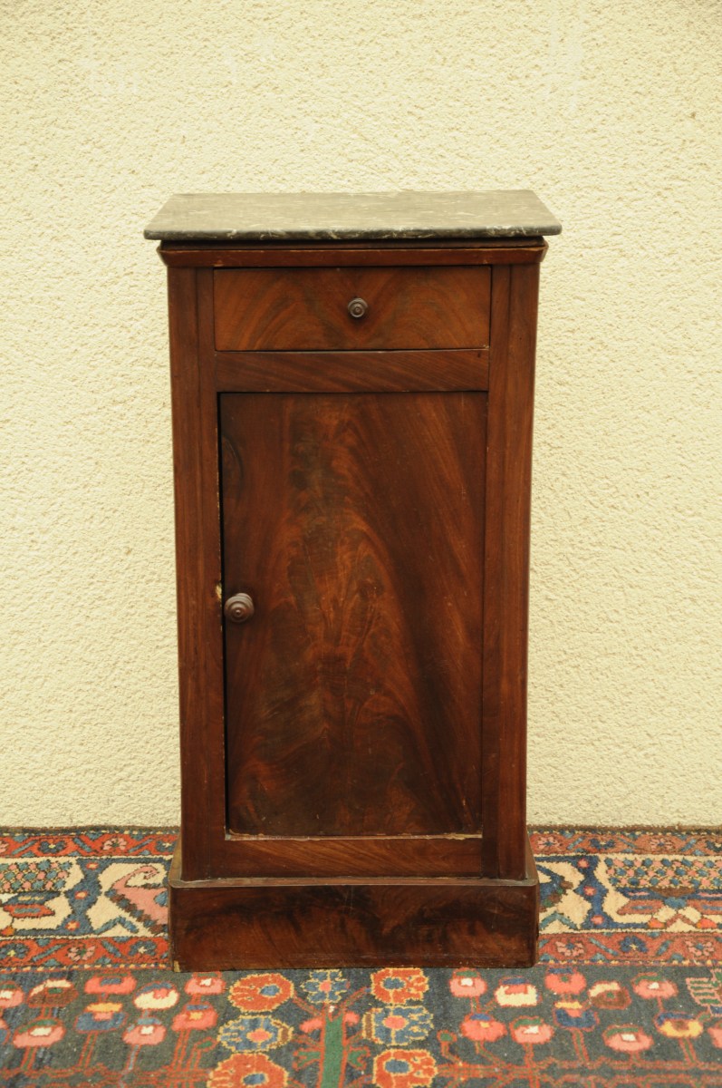 CHEVET en placage d'acajou, ouvrant par une porte et un tiroir. Dessus de marbre gris.