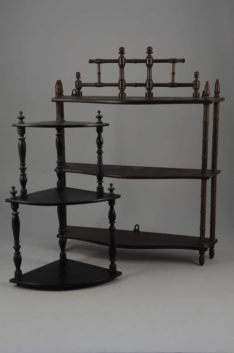 Une étagère d'angle à trois plateaux en bois noirci. Haut. 48 cm.