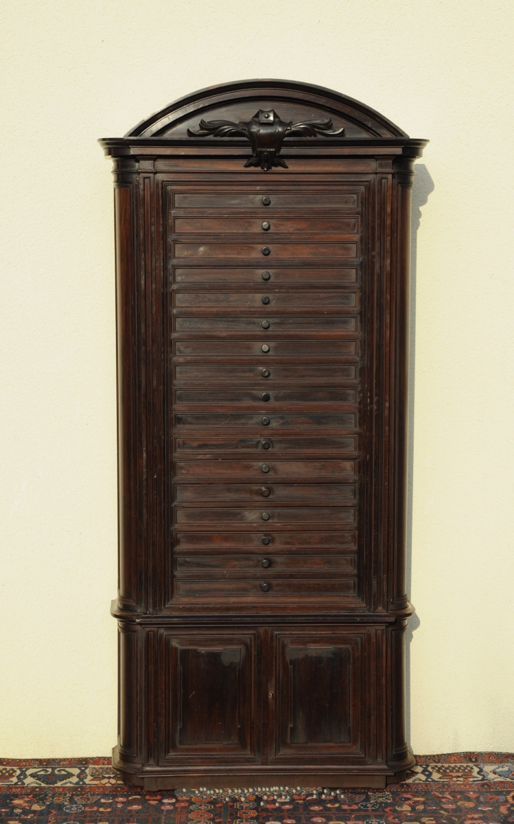 MEUBLE à DEUX CORPS en palissandre pouvant former médaillier. Il ouvre en partie inférieure par deux portes et en partie supérieure par 17 tiroirs. Fronton architecturé à décor de volutes feuillagées.