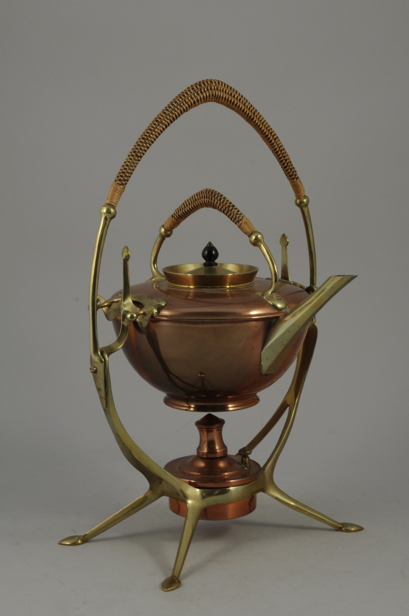 NÉCESSAIRE à THÉ, comprenant cinq pièces en laiton et cuivre, comprenant un plateau, un samovar, une théière, un sucrier et un pot à sucre. Manches garnis de rotin bicolore. Pièces marquées LC, à l'ancre et au caducée.