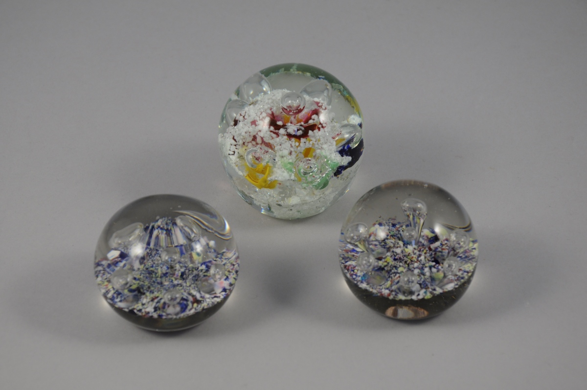 Trois PRESSE-PAPIERS SULFURES en verre avec bulles et inclusions multicolores.Début...