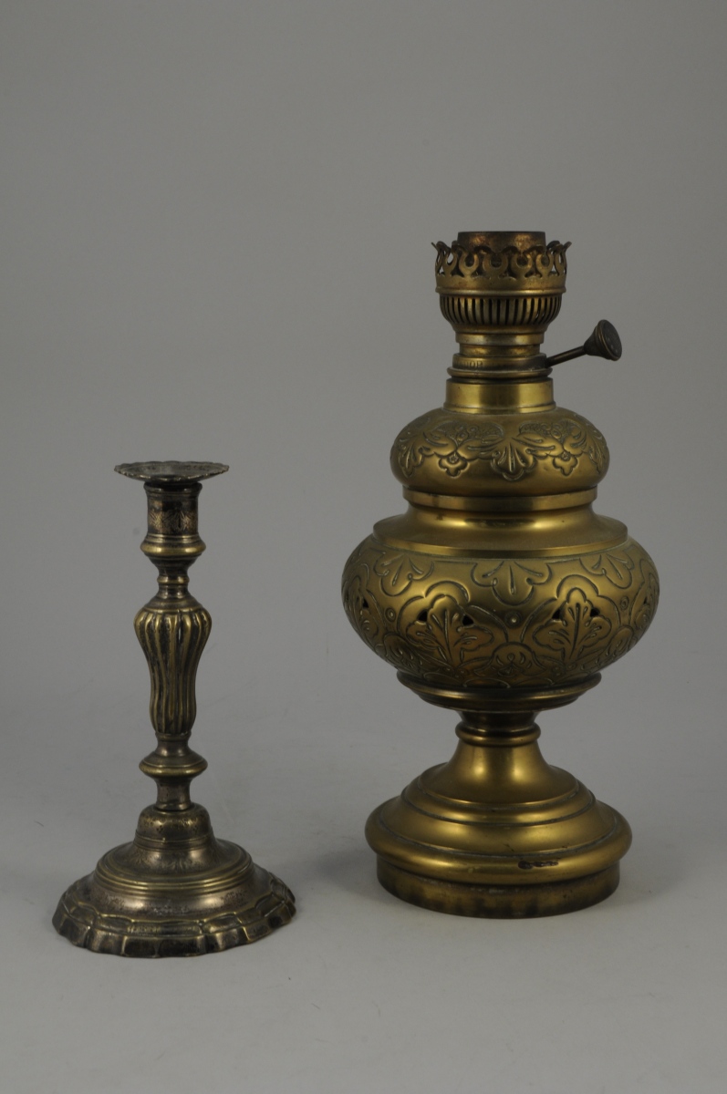 Jointe : Lampe à pétrole Matador en laiton, décorée au repoussé de palmes stylisées. Début XXème. Haut. 35 cm.