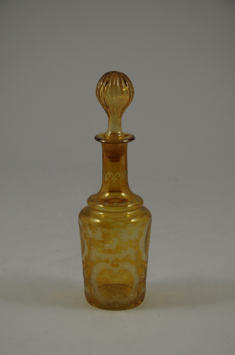Petite CARAFE en verre jaune, à décor gravé à la roue d'un chien, d'un cerf, de deux oiseaux et de réserves quadrillées. Bouchon à godrons.