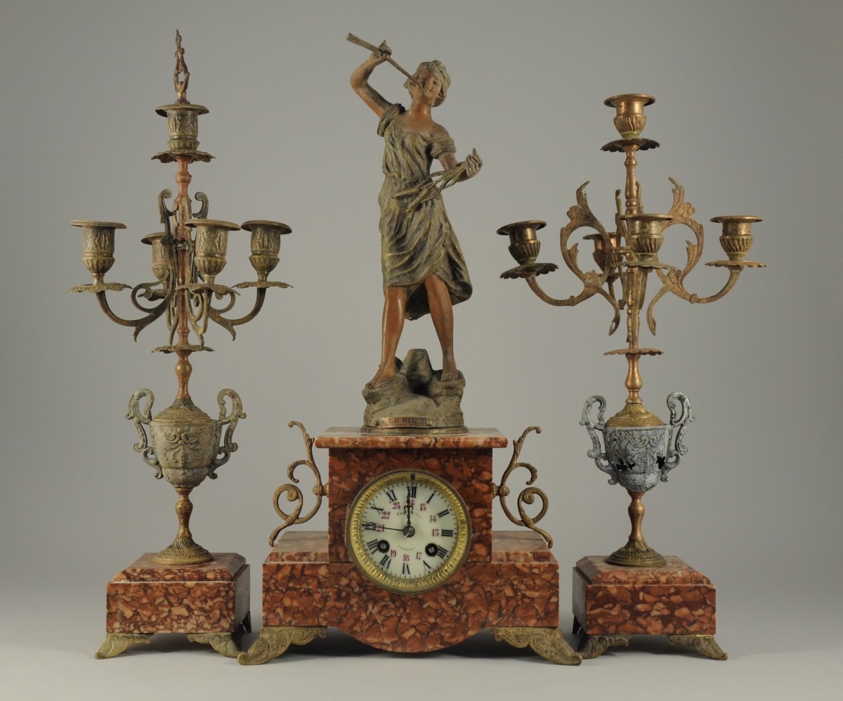 GARNITURE DE CHEMINÉE en marbre et régule composée d'une pendule surmontée de la déesse du fleuve Nil d'après Guillemin et de deux candélabres à cinq lumières sur vase ballustre. Cadran émaillé signé PRÉTESEILLE à VENDÔME. XIXe XXe siècle.