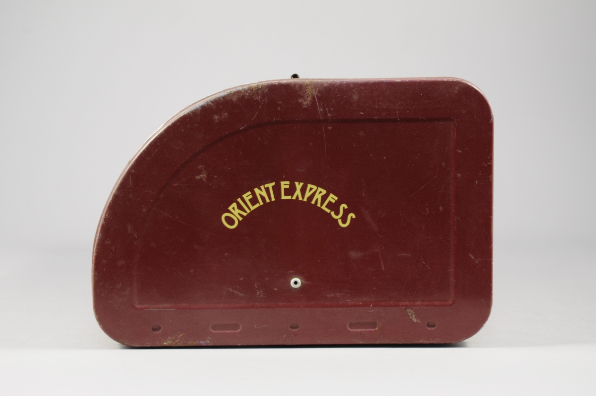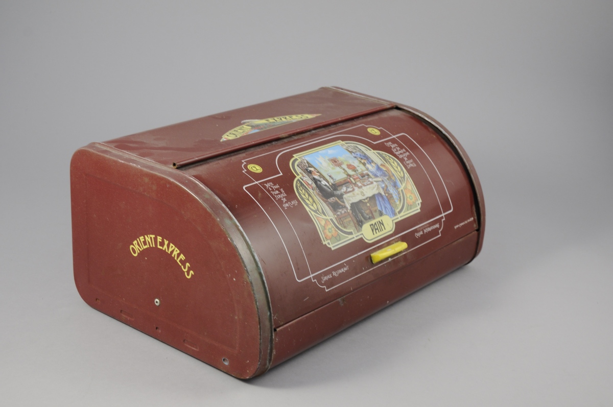 BOITE à PAIN en tôle peinte"Orient-Express". Décor d'un couple en habit du soir dînant dans le train sur fond de couleur " lie de vin ".
