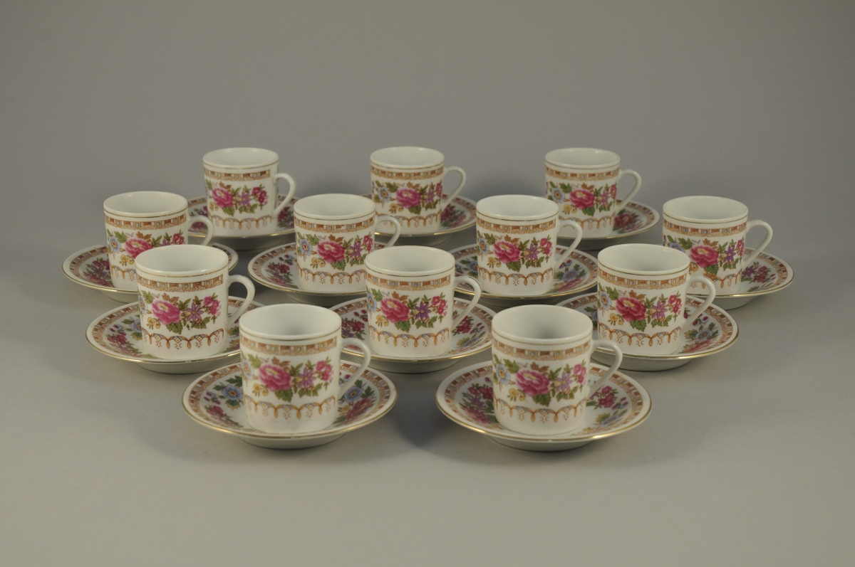 PARTIE DE SERVICE A CAFÉ en porcelaine de Chine. 12 tasses à café et 12 soucoupes. Travail moderne. (accidents)