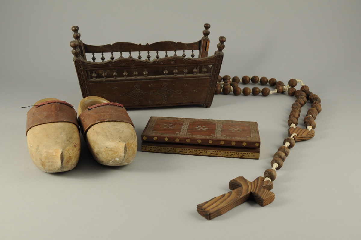 ENSEMBLE DE BIBELOTS : -lit à bascule en bois.-sabots. -chapelet...
