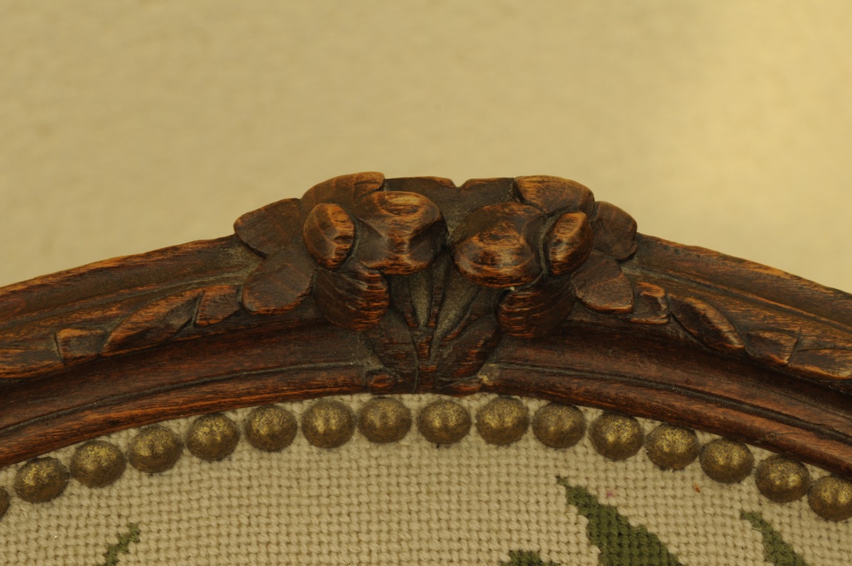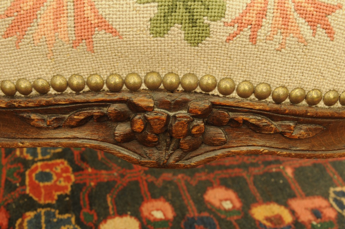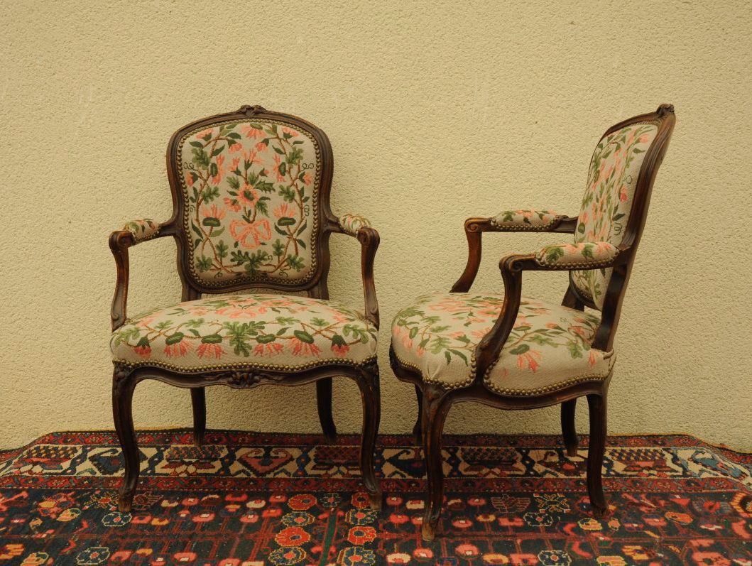 PAIRE de FAUTEUILS cabriolet en hêtre mouluré, sculpté et teinté. Le dossier légèrement cintré et les accotoirs en coup de fouet. Les traverses centrées d'un bouquet de fleurs. Ils reposent sur des pieds cambrés à décor d'une fleur et terminés par des feuilles d'acanthe.